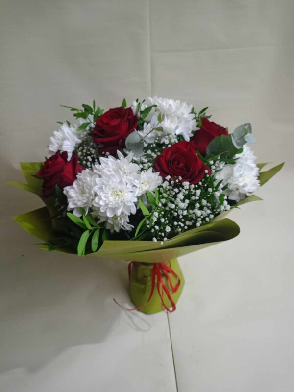 BukietDelikatna kompozycja kwiatów składająca się z jasnych gerber, czerwonych róż i białej margarytki. Wysyłka tego bukietu z naszej kwiaciarni to delikatny sposób