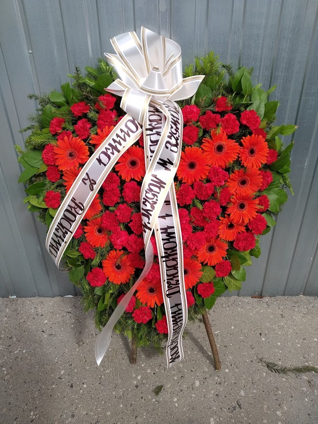 Wieniec w kształcie serca – Czerwone różeNasi utalentowani floryści z kwiaciarnia Białystok Ambrosia zapewniają odpowiednią dbałość aby Twoje pogrzebowe kompozycje kwiatowe zostały drobiazgowo zaplanowane i umieszczone w wieńcu,